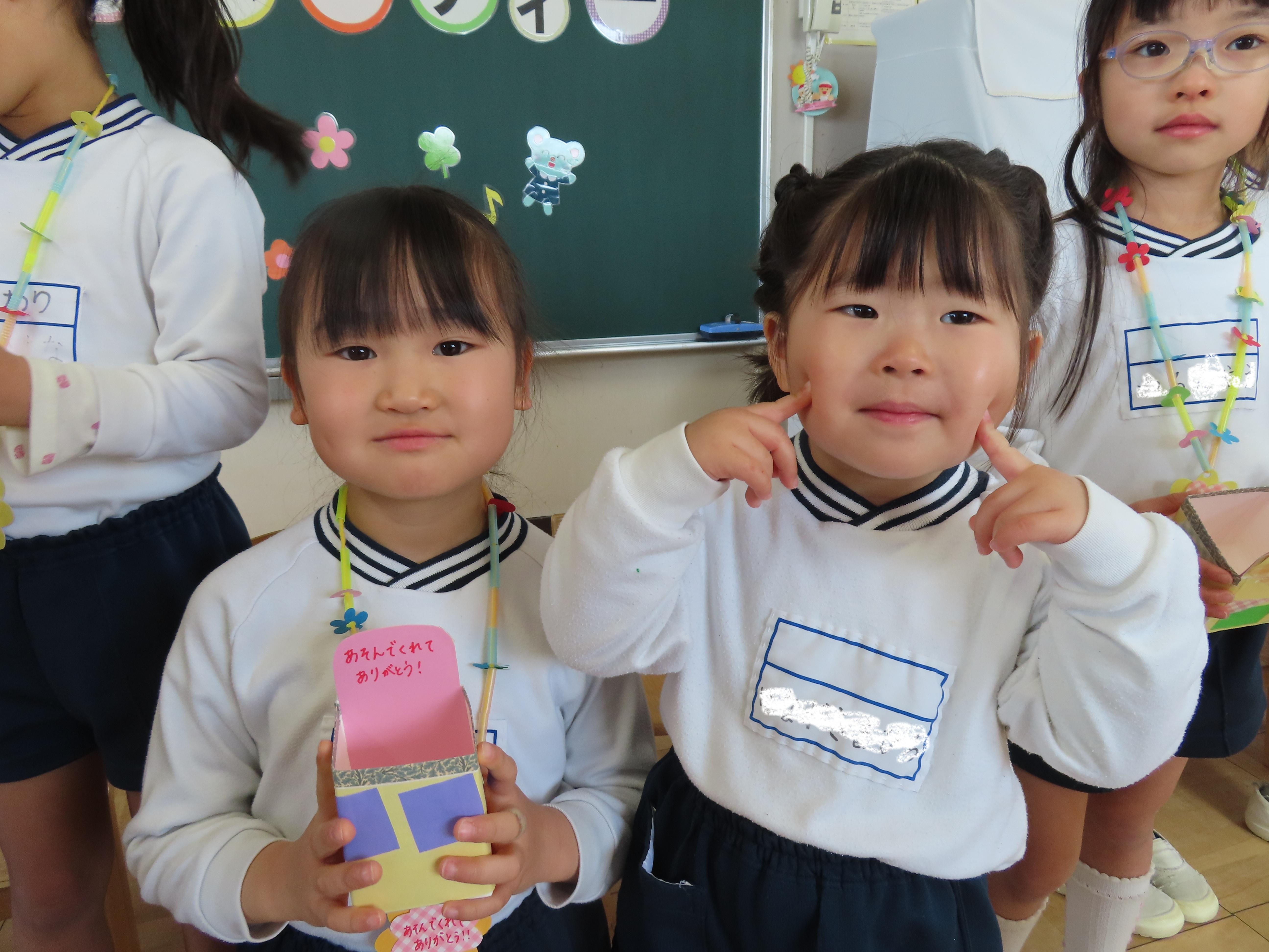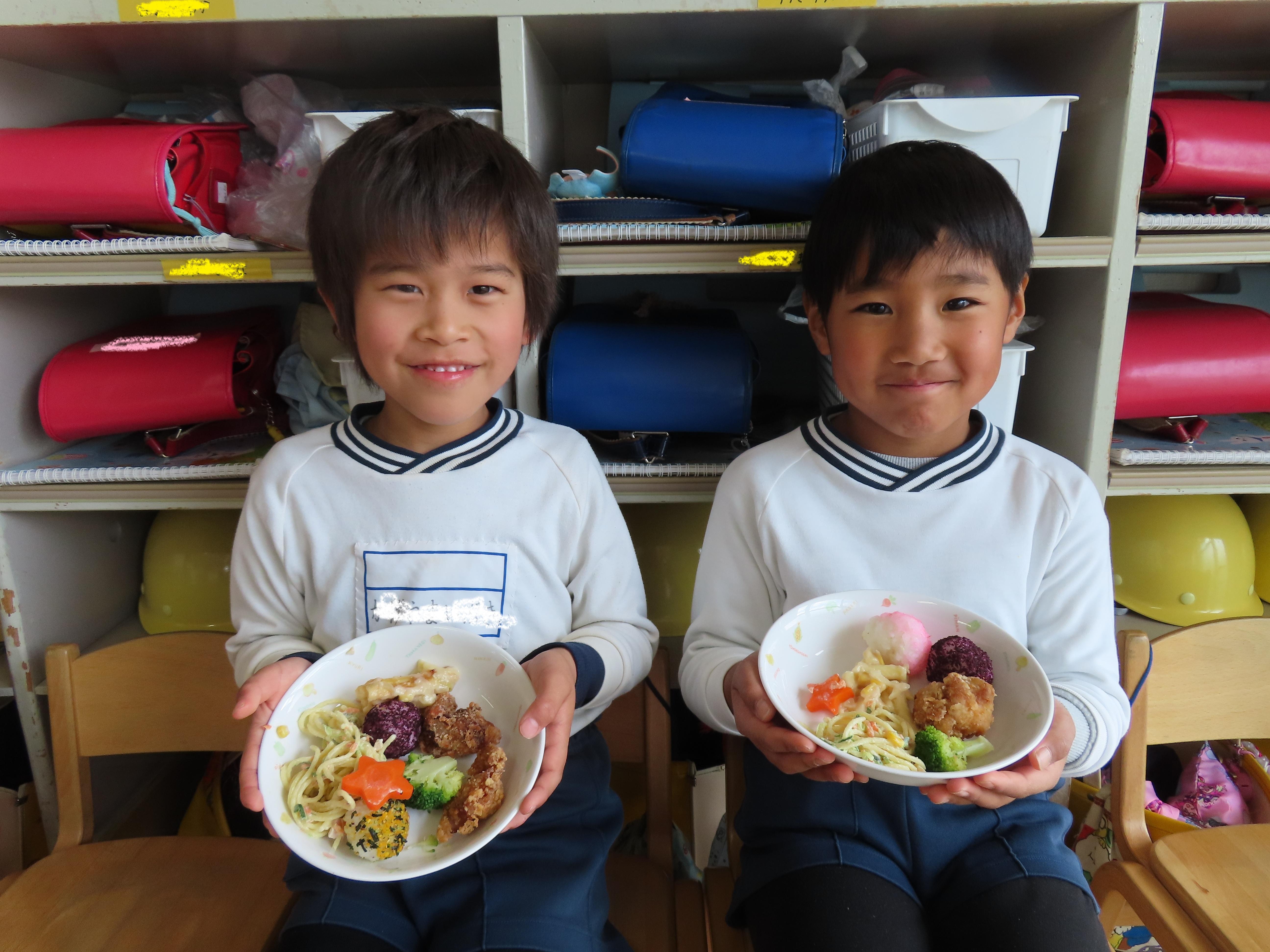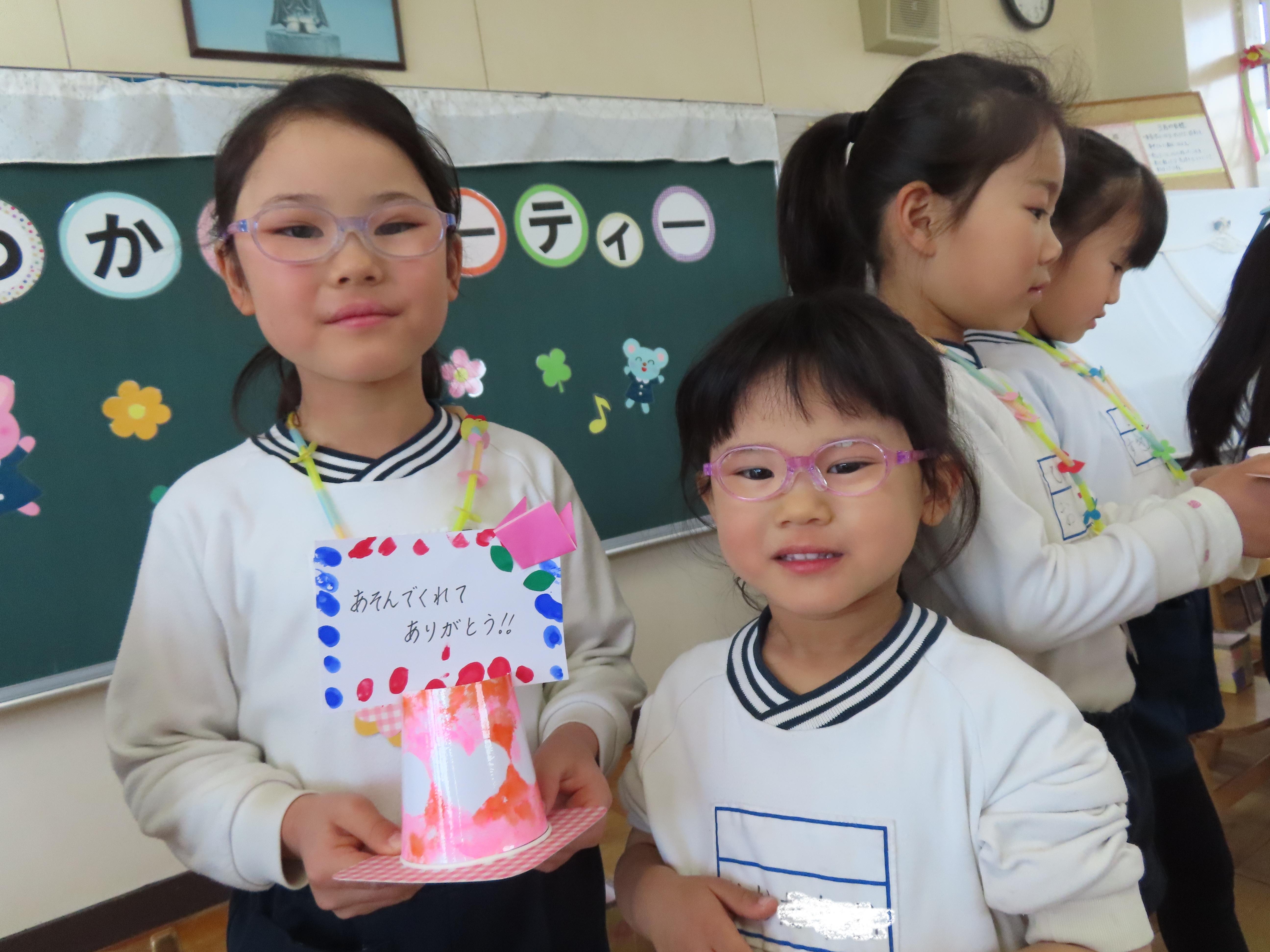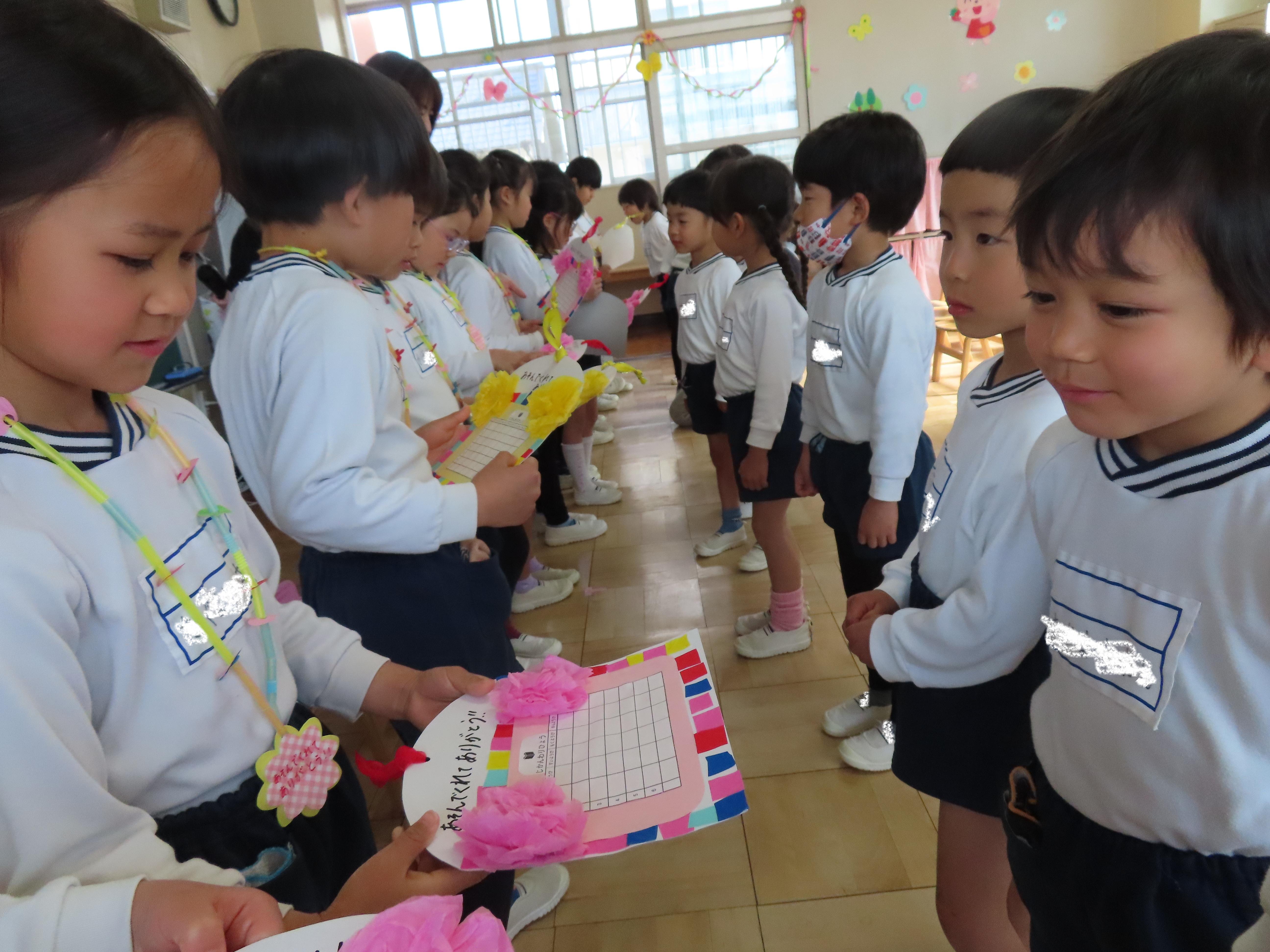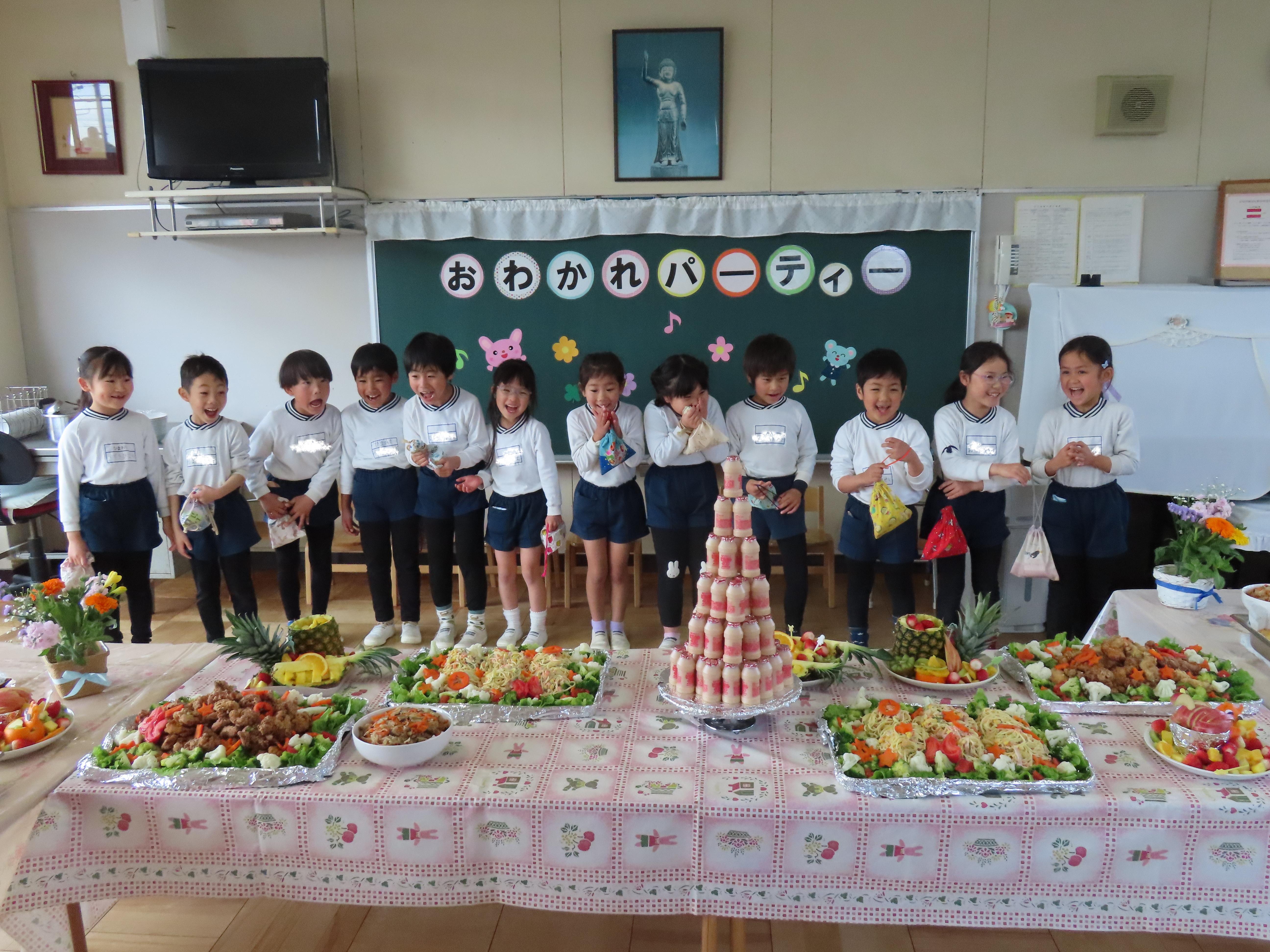 ひまわり組(5歳児クラス)さんとのおわかれパーティーが開かれました。各クラスの子ども達から素敵なプレゼントや“ありがとう”の言葉をもらい、少し照れながらも嬉しそうにしていたひまわりさん。楽しみにしていたパーティーランチでは「わあ!」と目を輝かせ、「どれから食べようかな~」とワクワクしながらバイキングを楽しみました。「おいしいね!」とお友だちとの会話も弾み、笑顔いっぱいでした