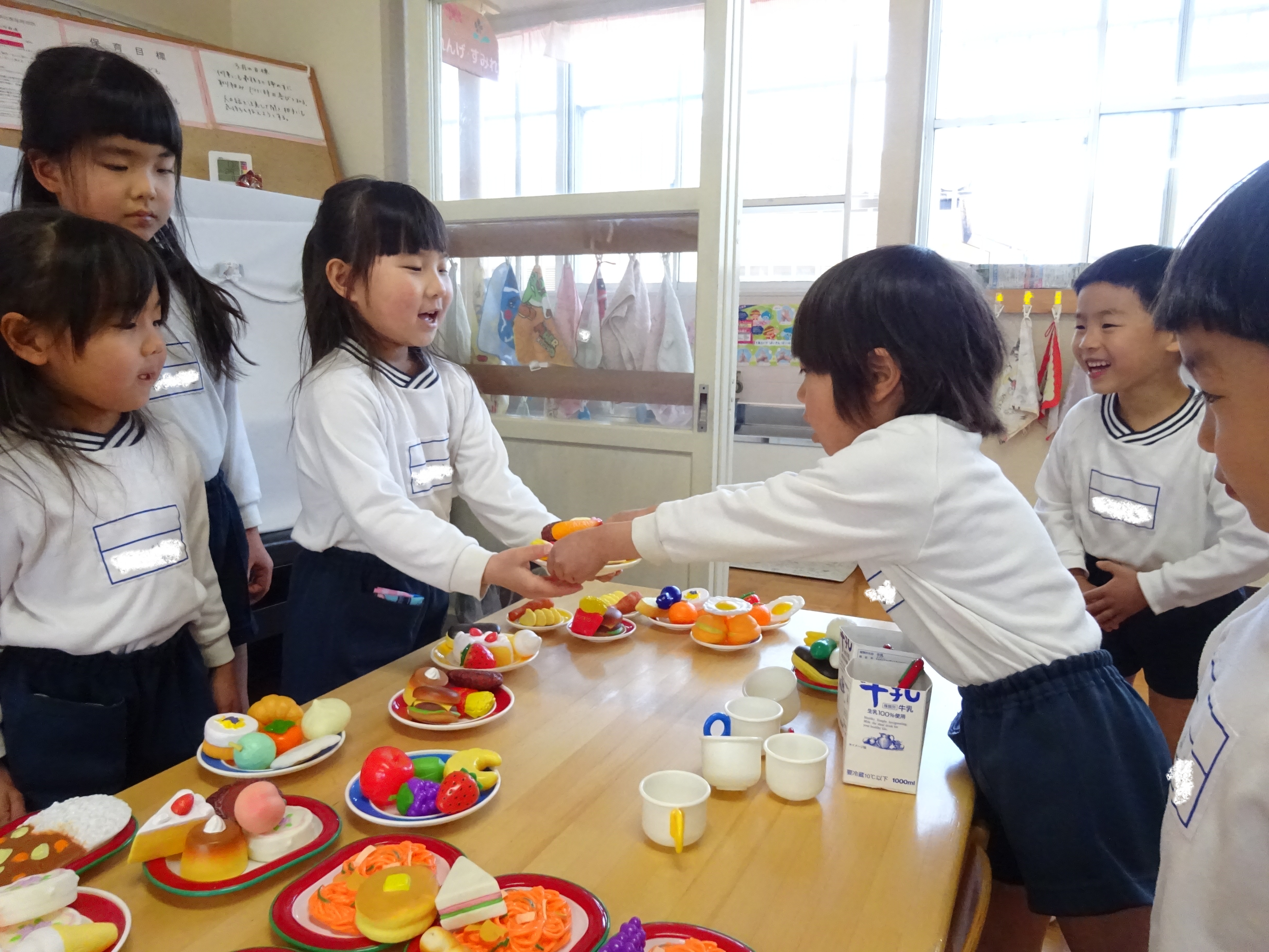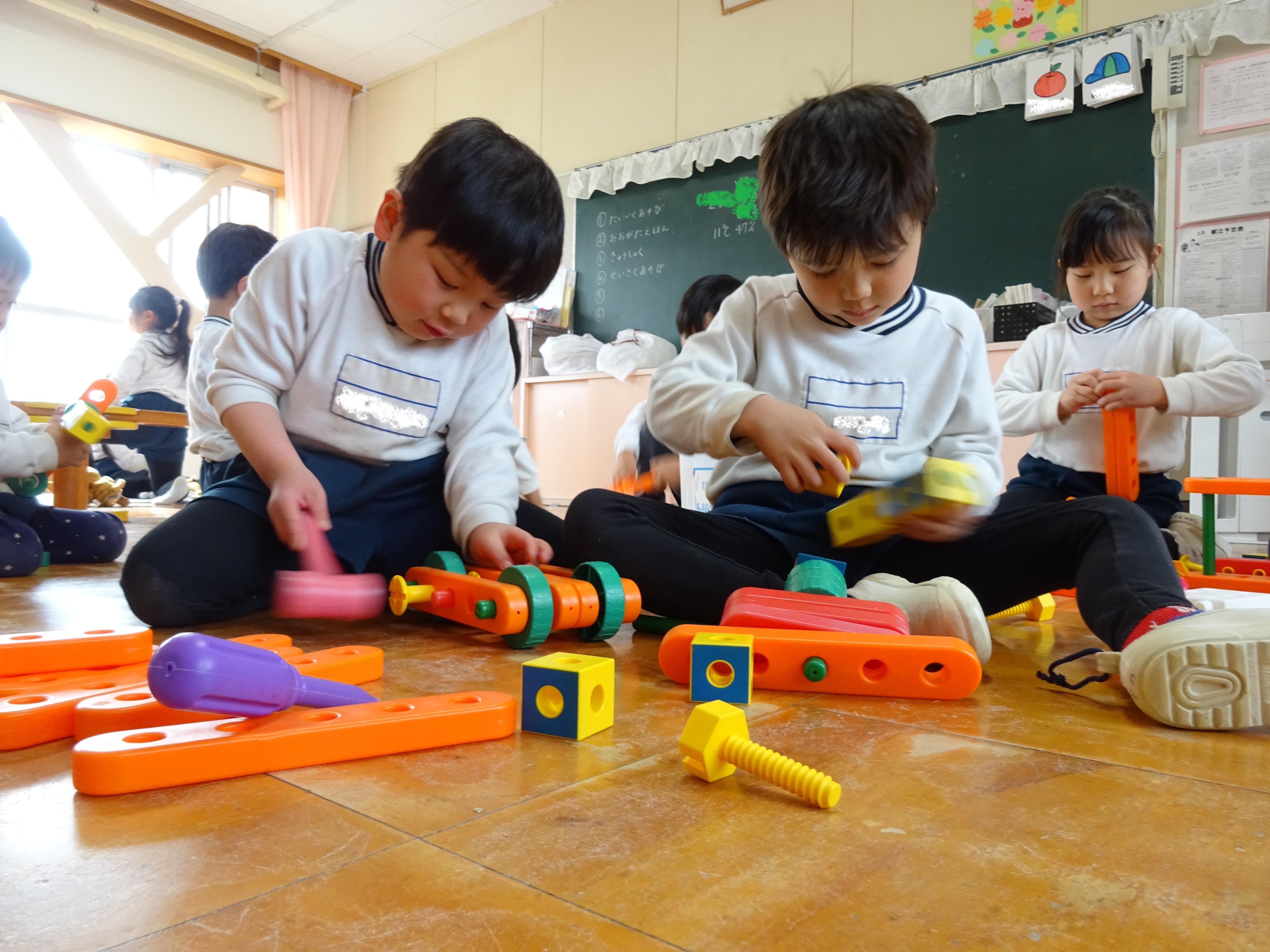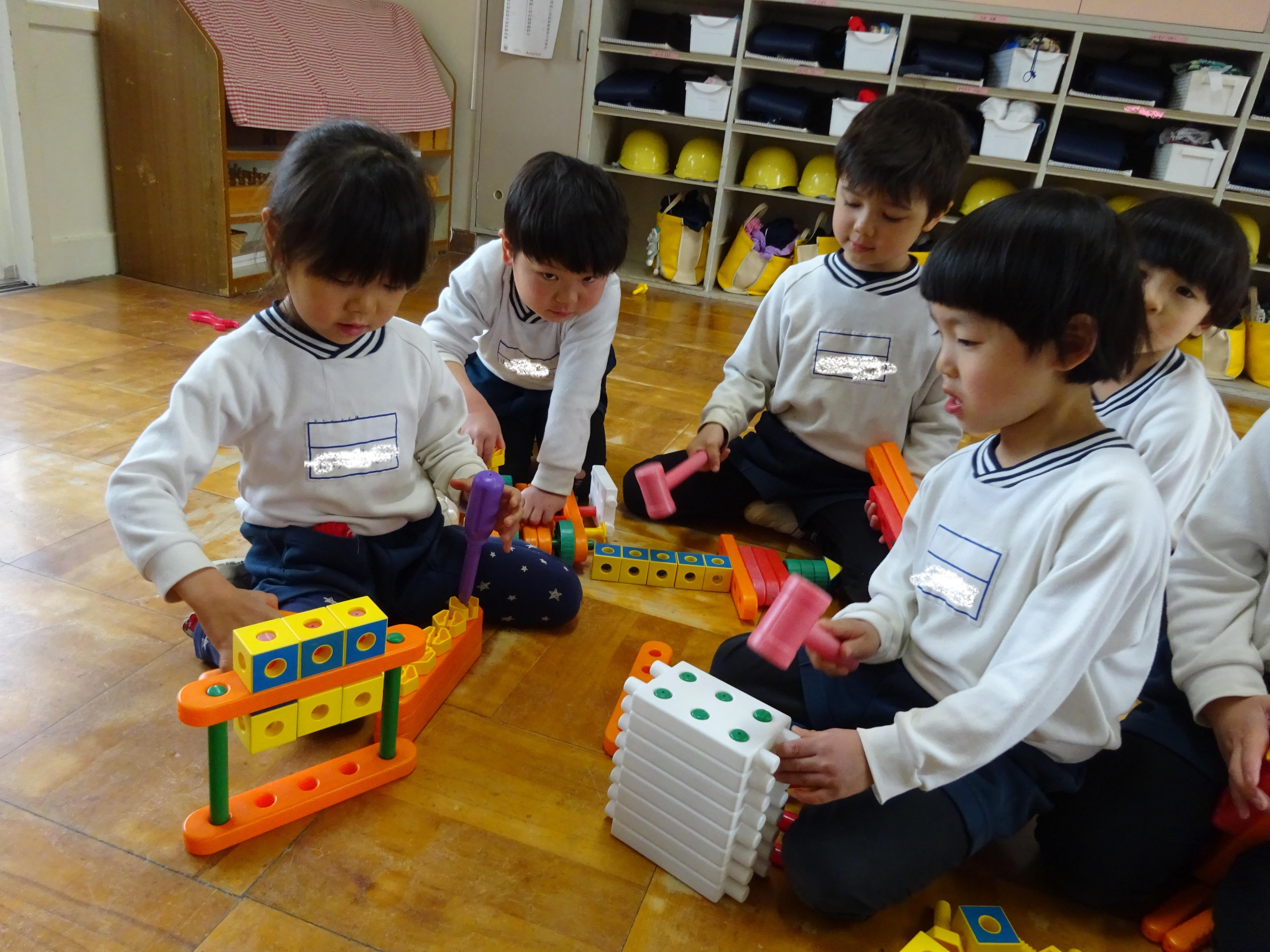 お部屋では、コーナー遊びを楽しんでいます。一人ひとり好きな遊びコーナーを選び、ラキュー、ブロック、おままごと等楽しんでいます。「れんげ組さんも一緒に遊ぼう!」と誘いかけ関わる姿が見られ「お兄さん、お姉さんだから!」という気持ちが芽生えた中でのやりとりが増えたように感じます。