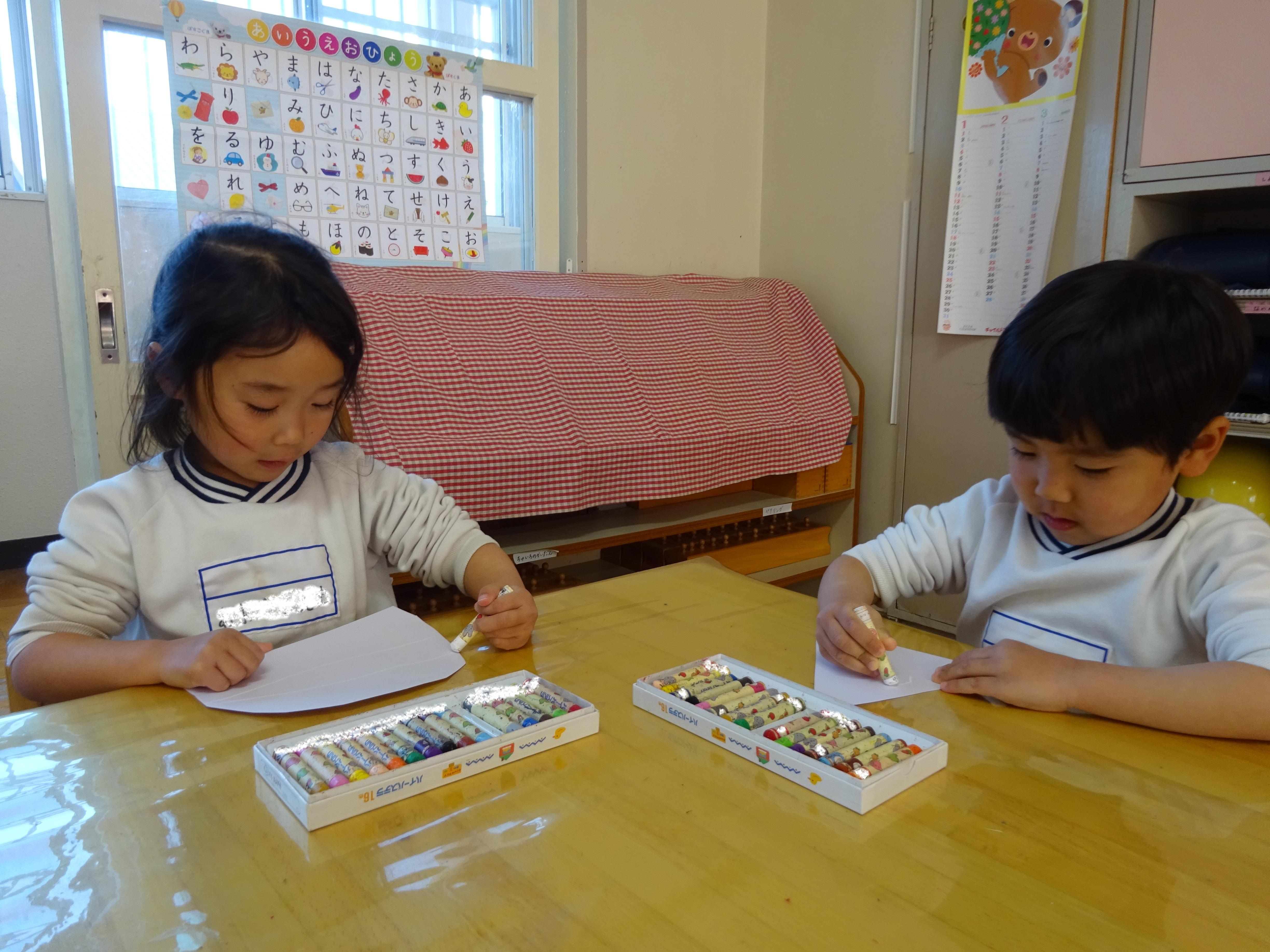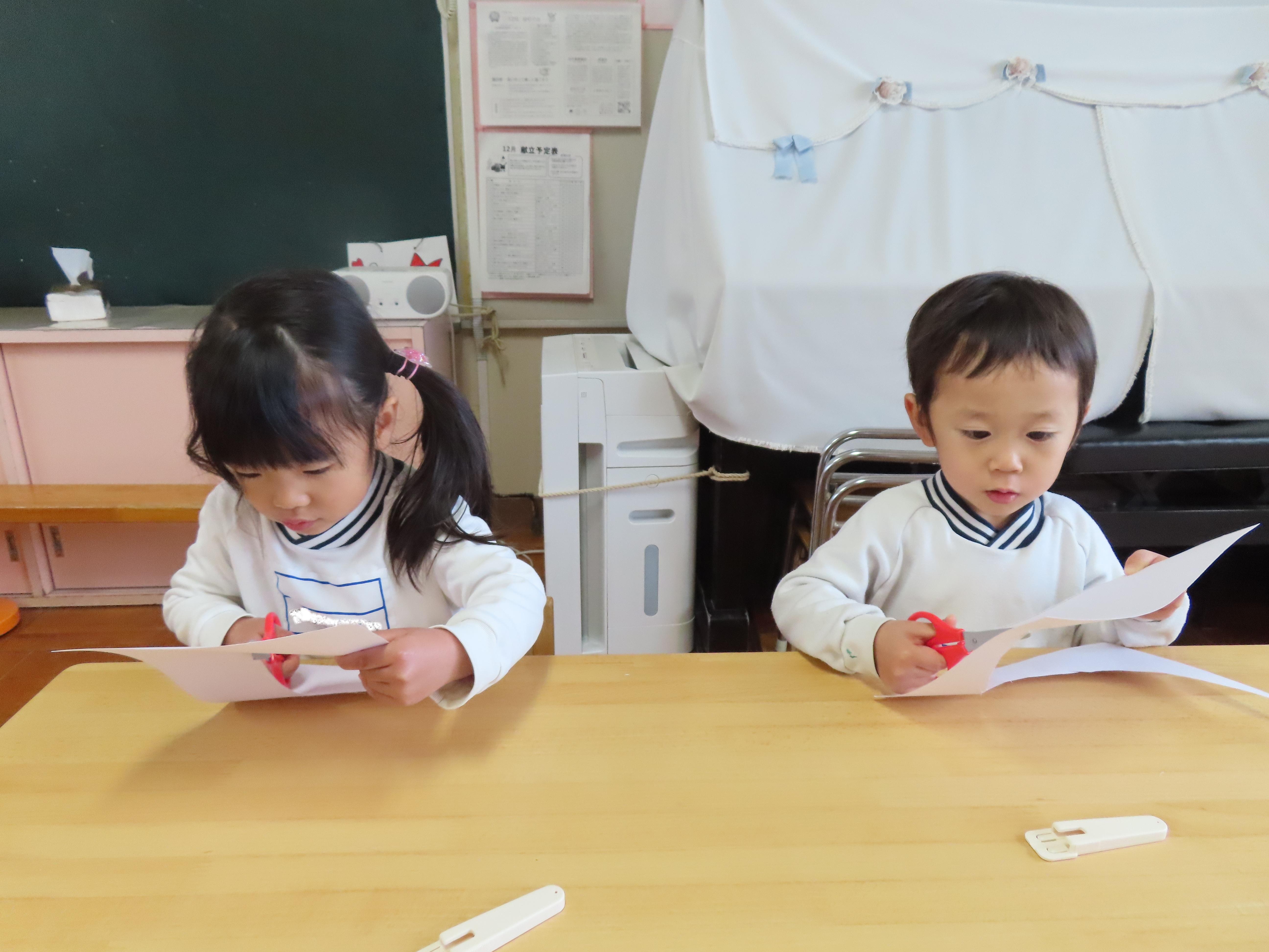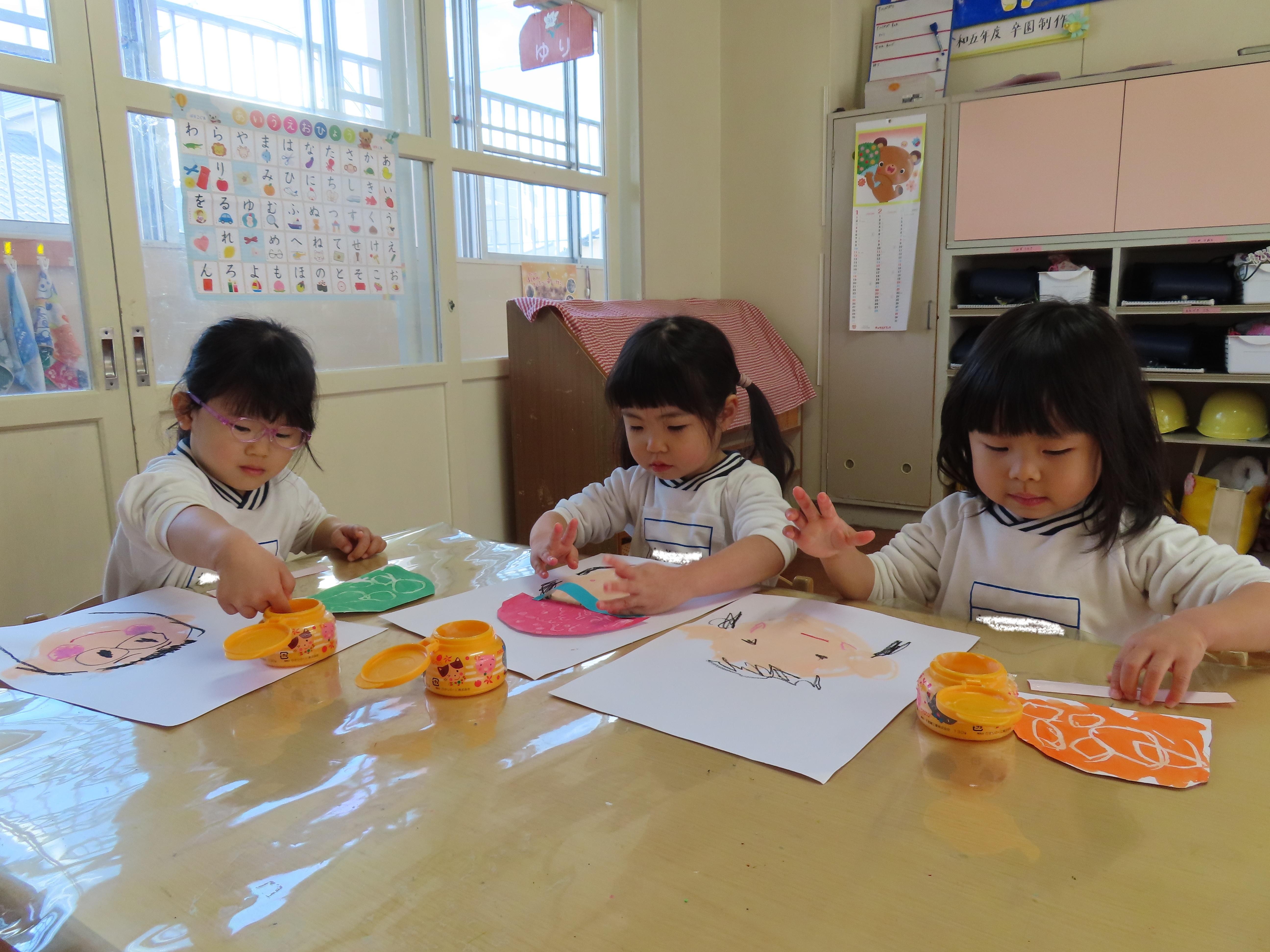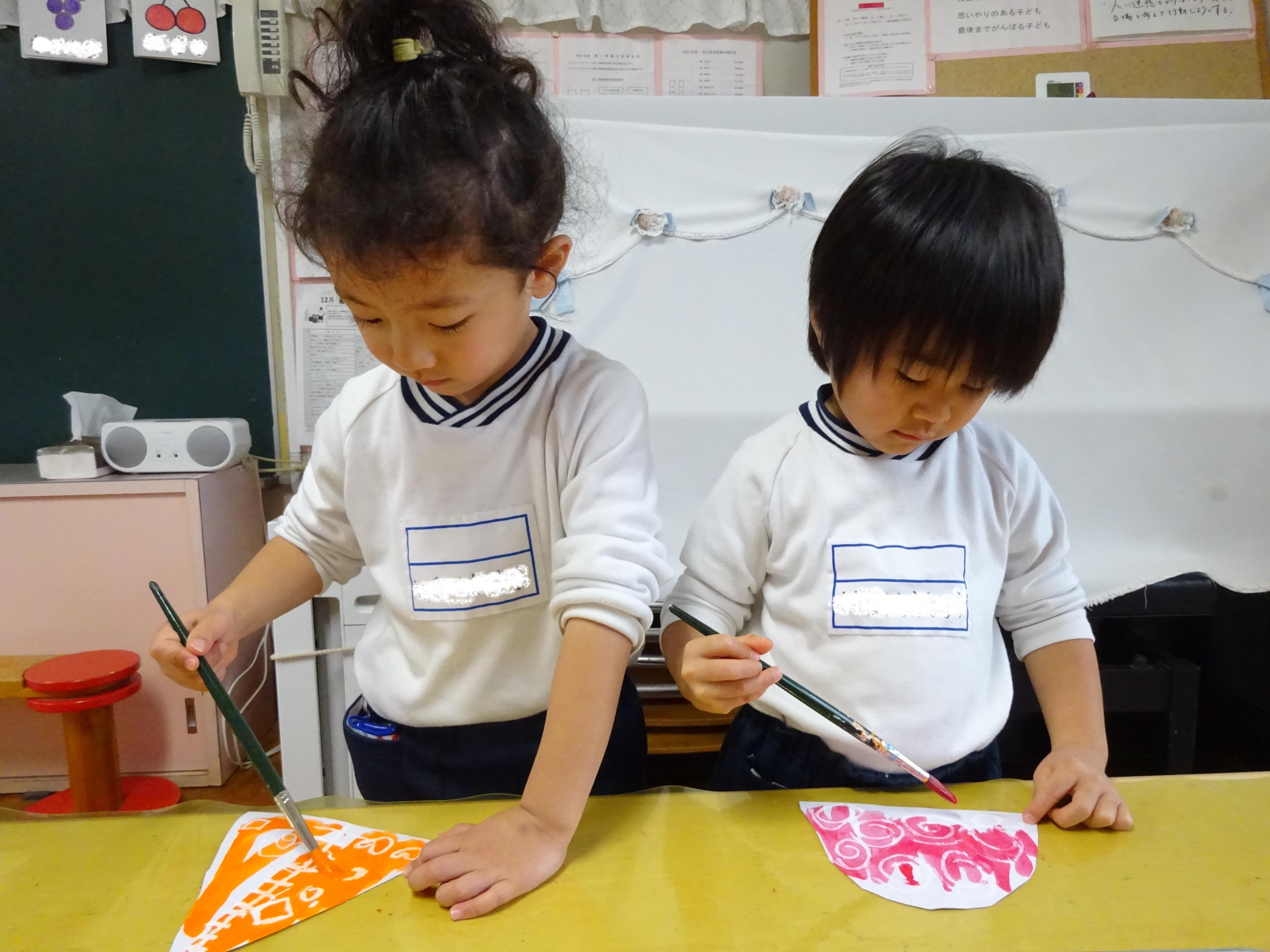 ハサミや絵の具、のりなどそれぞれの工程を楽しんで制作に取り組んでいます。はじき絵やビー玉転がしをしたり、様々な技法もできるようになりました。完成した作品はクラスごとに飾り、友達と見せ合ったり、おうちの方に見てもらったりすることで喜びや達成感を感じています。