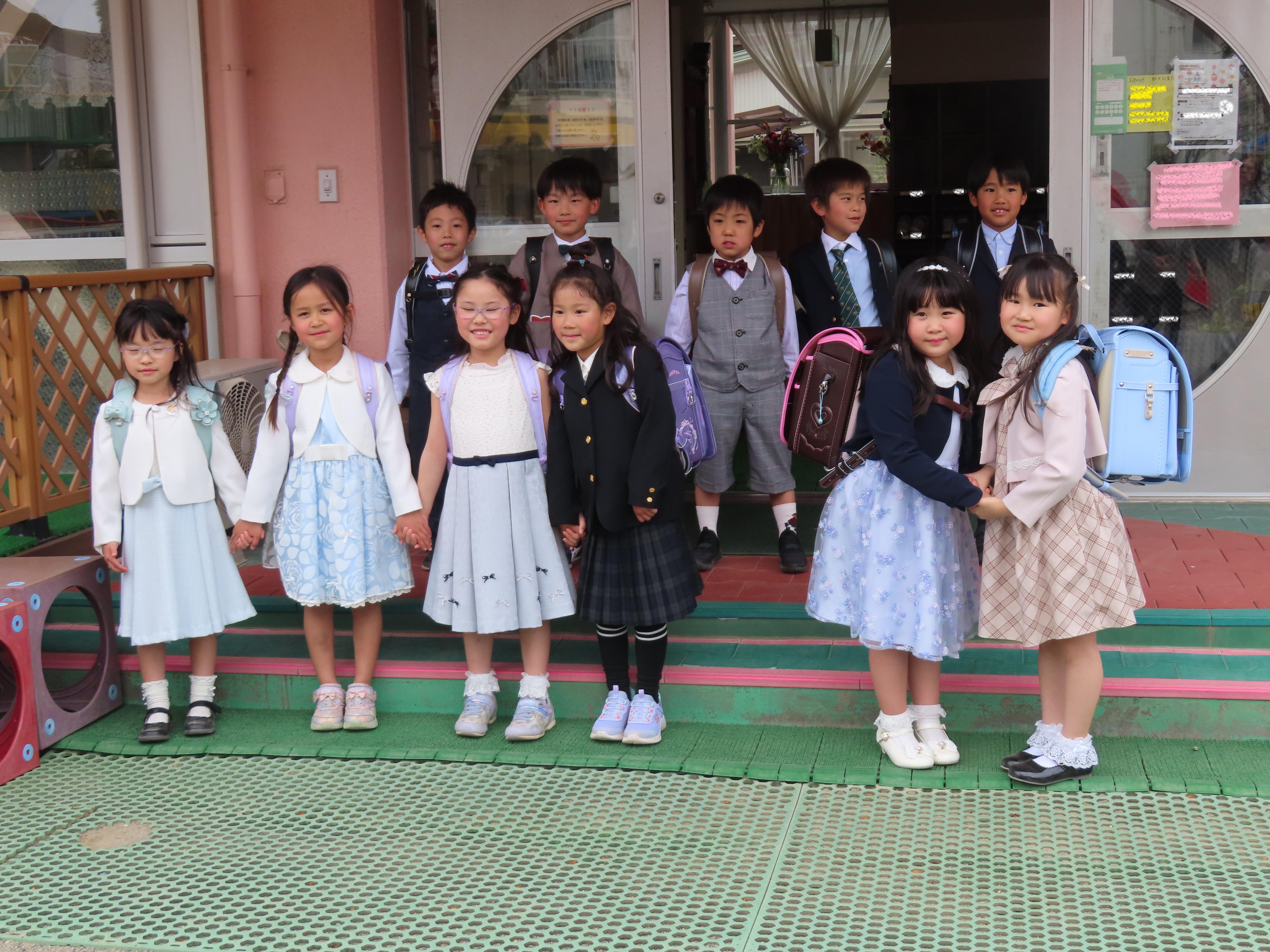 先月卒園した子ども達が小学校の入学式を終え、ランドセル姿を見せに遊びに来てくれました。久しぶりにみんなで顔を合わせ、嬉しそうにランドセルを見せ合い、笑顔いっぱいでした。楽しい小学校生活を過ごしてね!